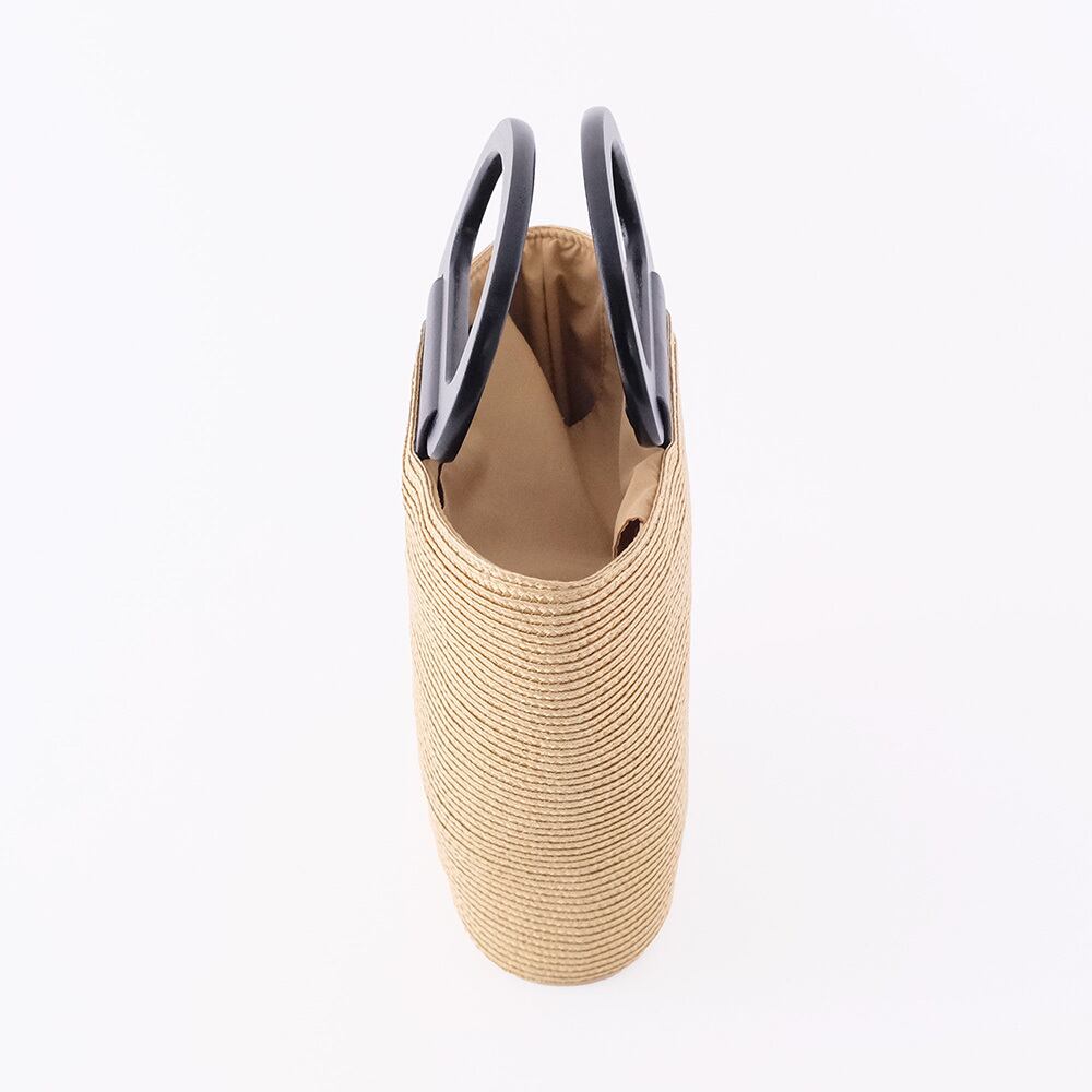 軽さがうれしいポリプロピレン素材のバッグには握りやすいラウンド型のウッドハンドルを採用しています。コーディネートし易いシックな色合いと上品な光沢が、大人の女性や母の日のギフトにもピッタリです。外出時に物が増えても容量にゆとりが出るよう、開口部はカーバー布を付けています。財布にスマホ、化粧ポーチ、真夏のお出かけ時に買った飲み物(ペットボトル)を入れても、上から被せるだけで中身が見えにくい安心仕様です。