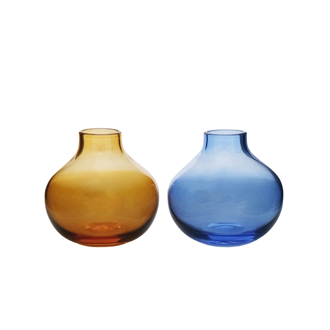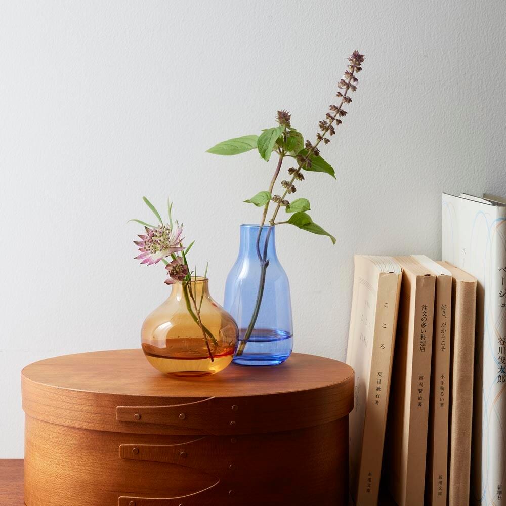 落ち着いた色合いのアンバーと、鮮やかなロイヤルブルーが目を引くフラワーベース。庭で咲いた小さな花や、公園に咲いてた小さな花などそっと一輪だけ飾っても絵になる花瓶は、小ぶりながらもしっかりと存在感もあり日常生活に彩を加えてくれるアイテムです。