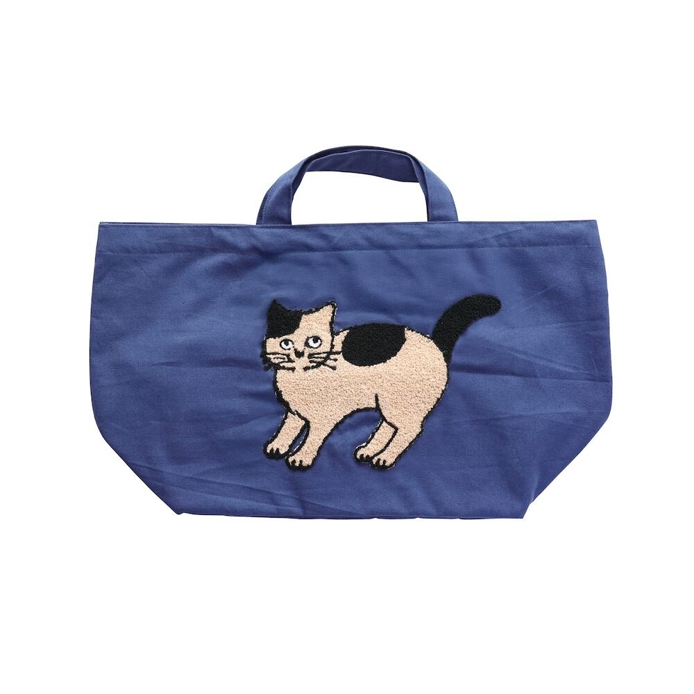 ボート型のトートバッグに、ふわふわのモコモコ刺繍でネコの顔をあしらっています。