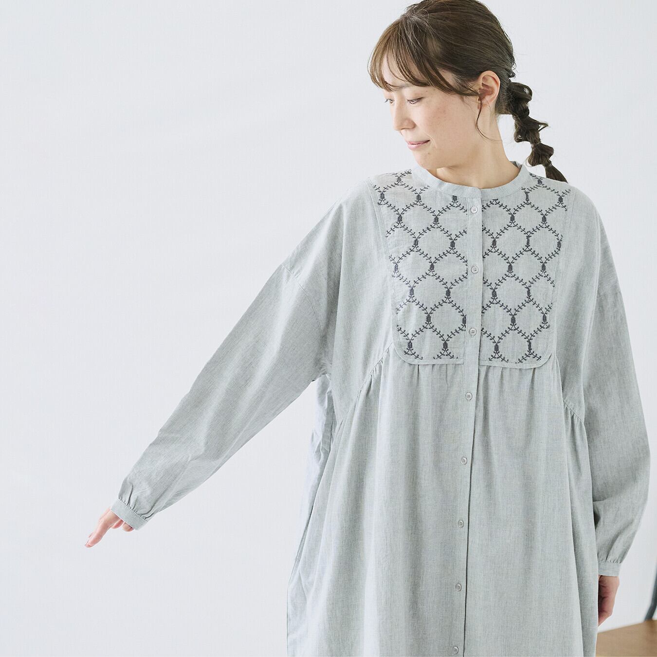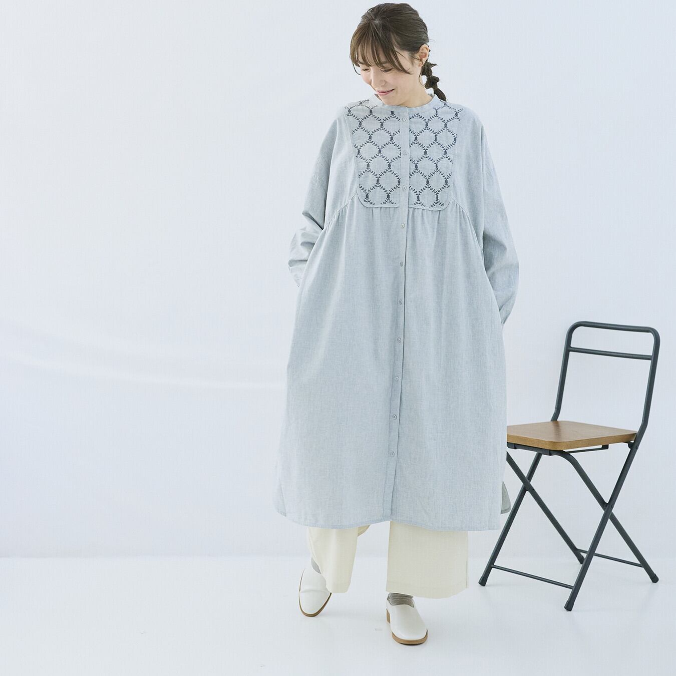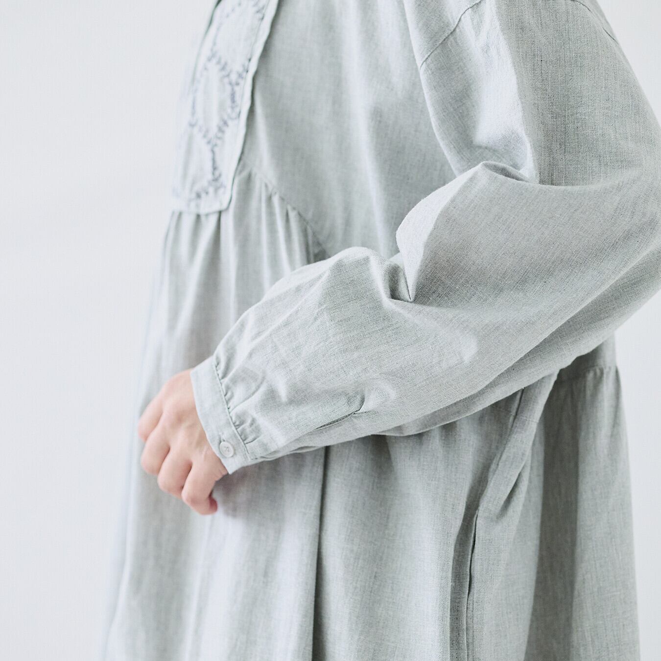 ○素材綿麻の生地特有のさらりとした肌触りが心地よく、日常使いにぴったりの軽さが魅力。刺繍部分は同系色でまとめ、落ち着きある上品な印象に。春先にも長く着られる、やわらかい風合いのワンピースです。
