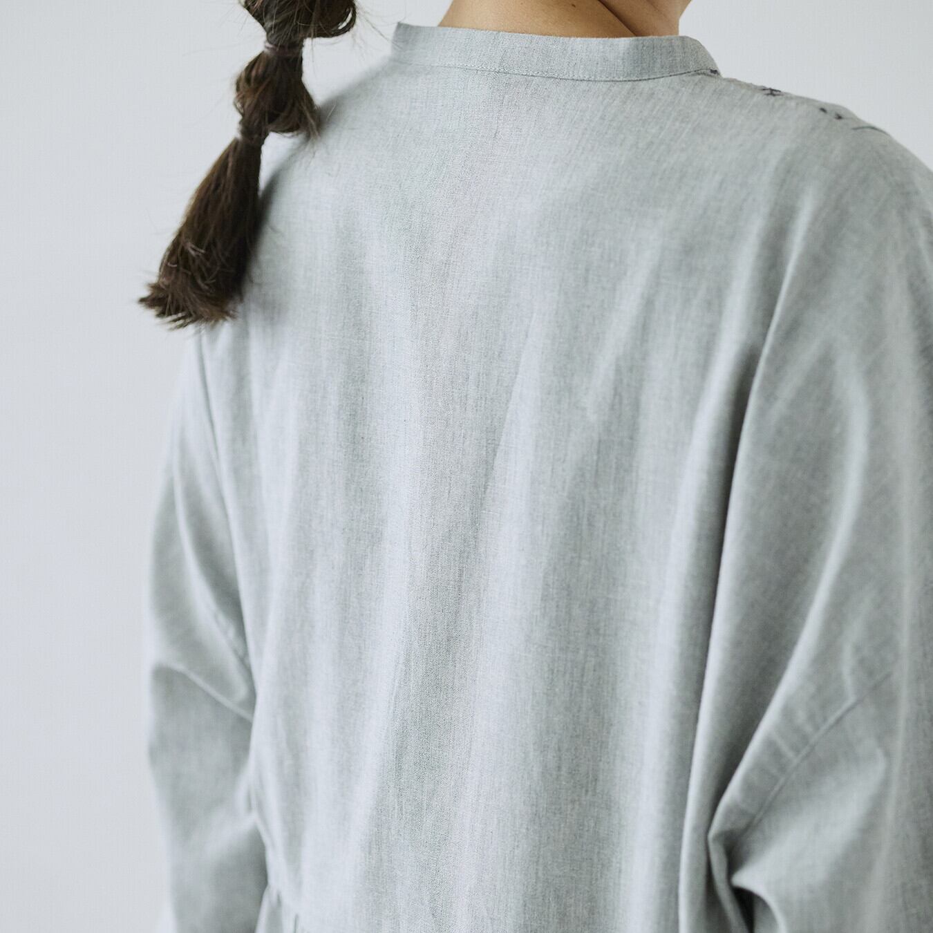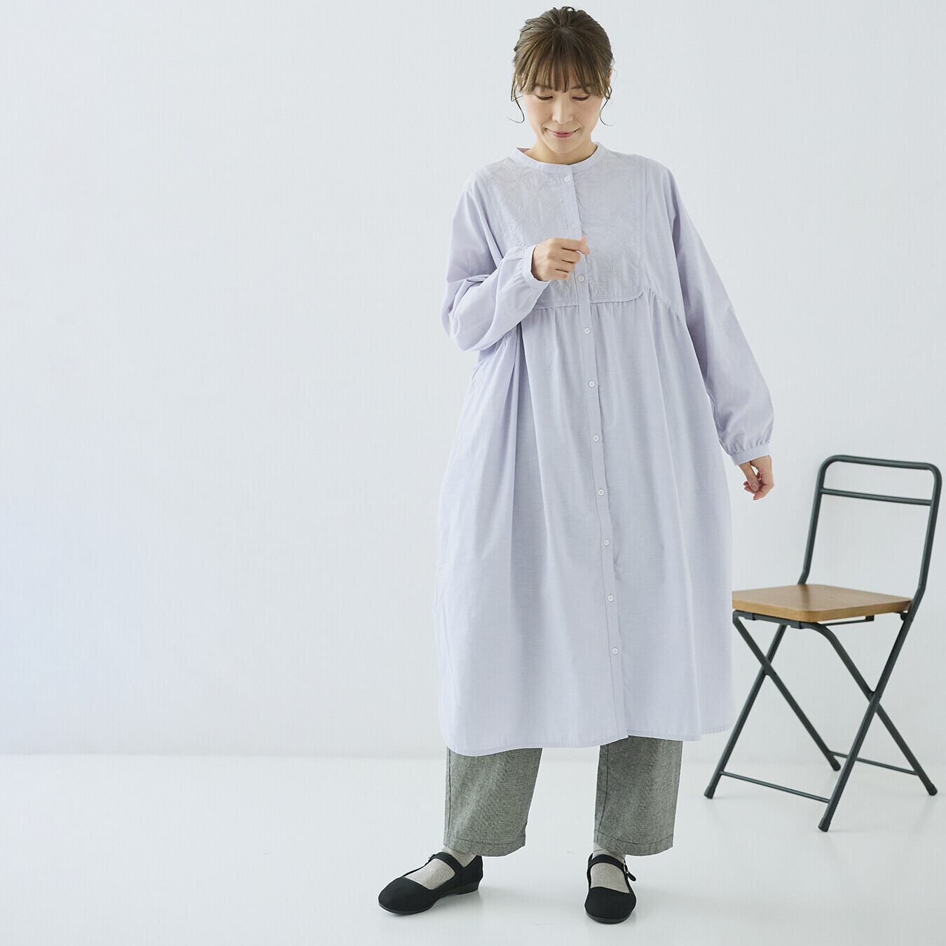 ○ポイント・前ヨークに施した草花モチーフの刺繍が上品で華やか・前後にギャザーを入れた、ゆるやかなコクーンシルエット・前開き仕様で羽織としても使える2WAYデザイン ▶軽やかで肌なじみの良い素材感が、季節の変わり目にも心地よく活躍します。