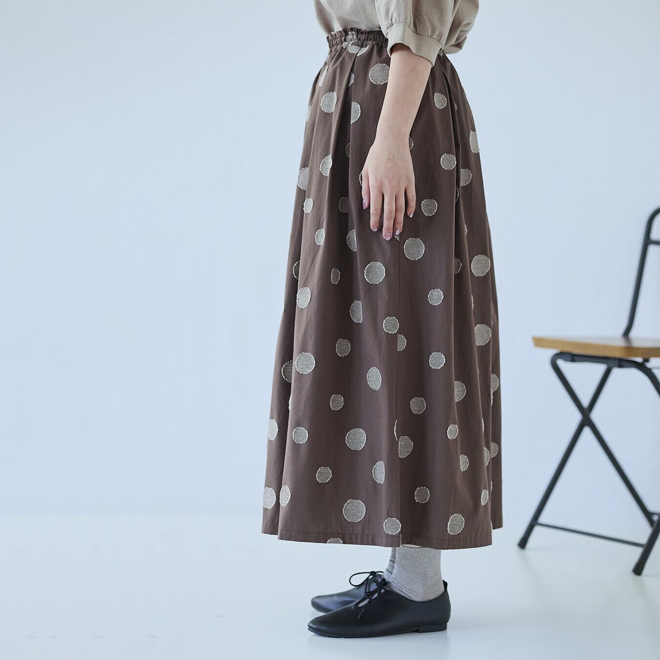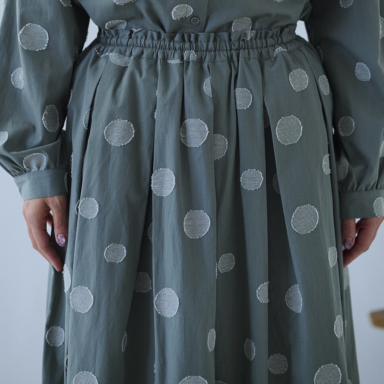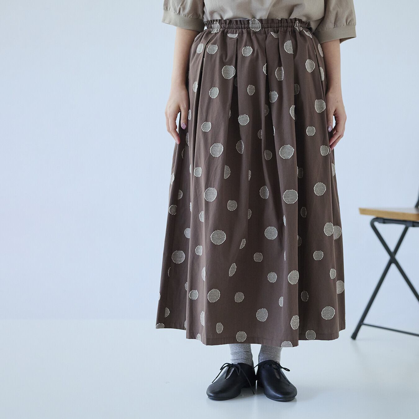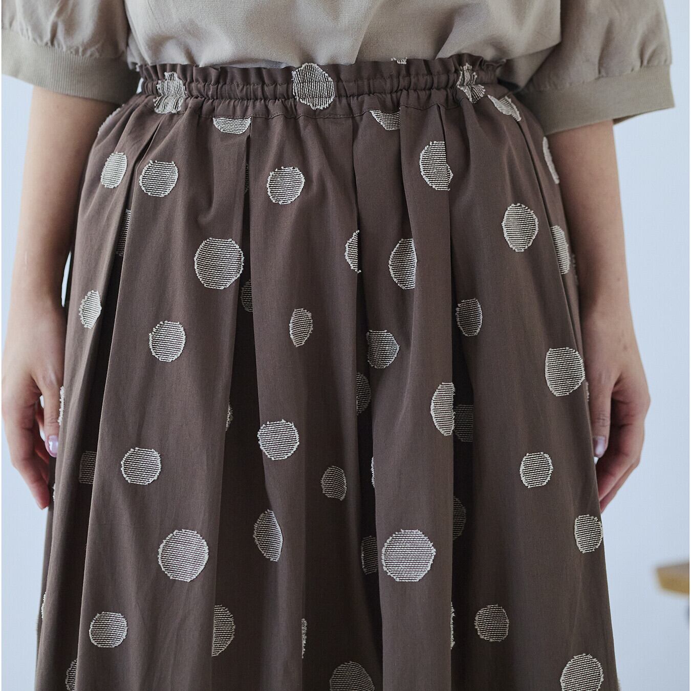 ○ポイント・ジャガード織りのランダムドット柄で、甘すぎない大人表情・ウエスト総ゴム+内紐付きで、ストレスフリーな穿き心地・同素材トップス展開あり、セットアップ提案で売場づくりに◎ ▶ ナチュラル派バイヤー様におすすめの主役スカート
