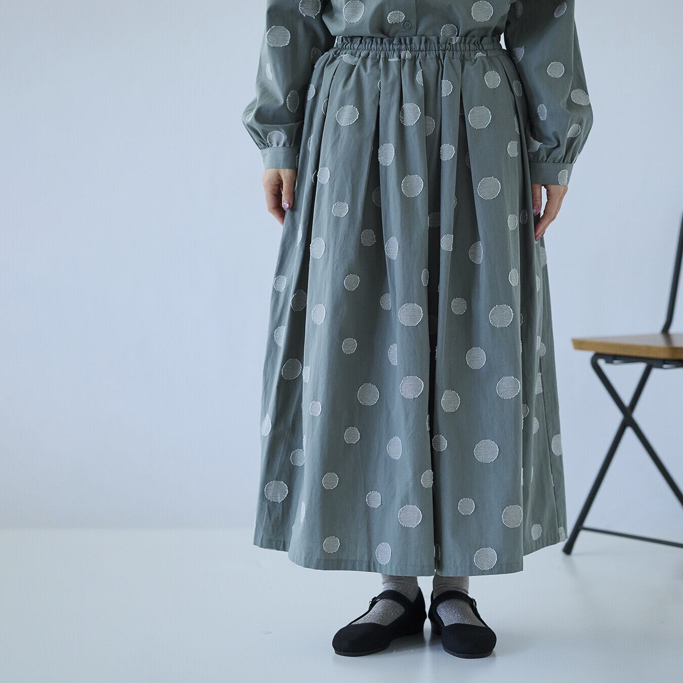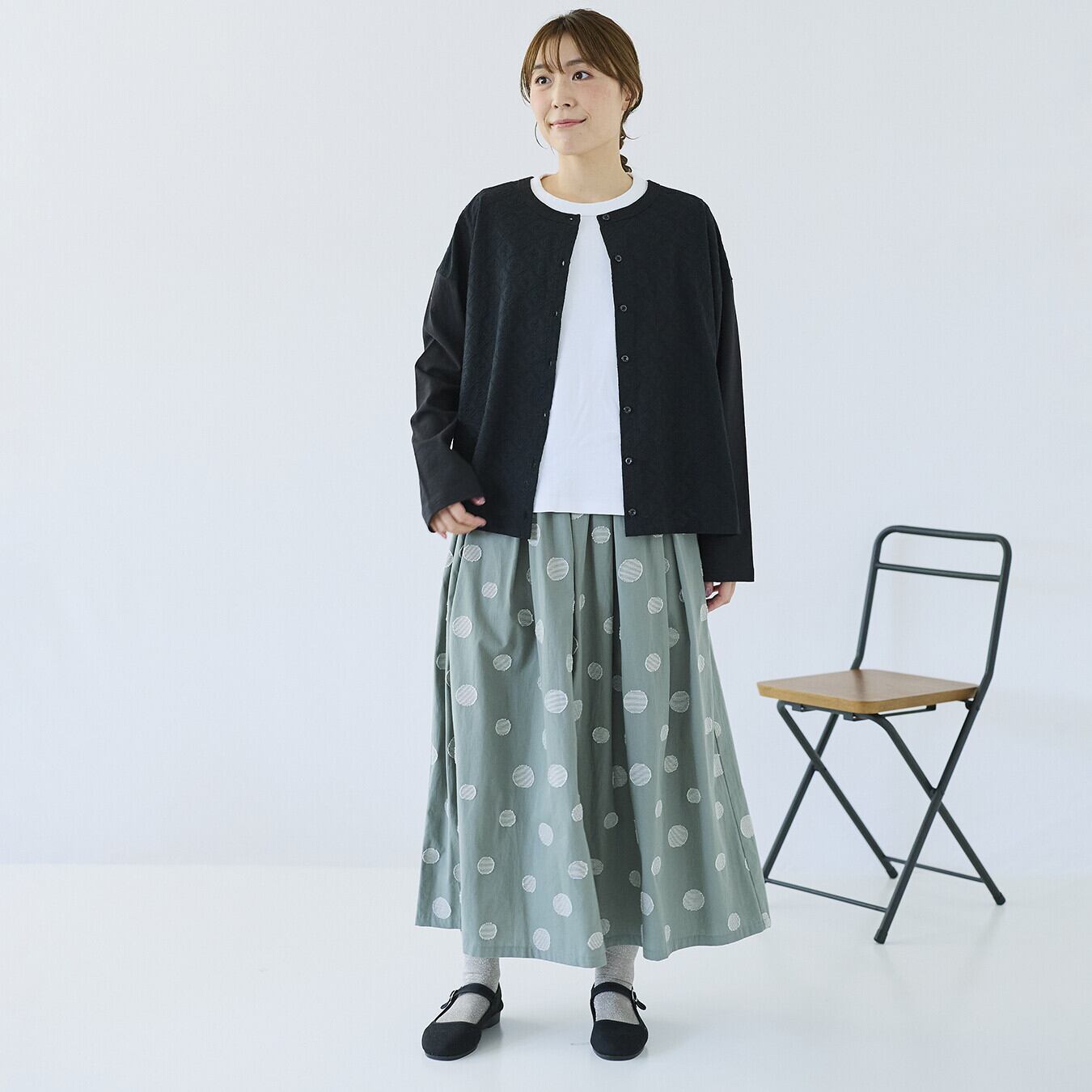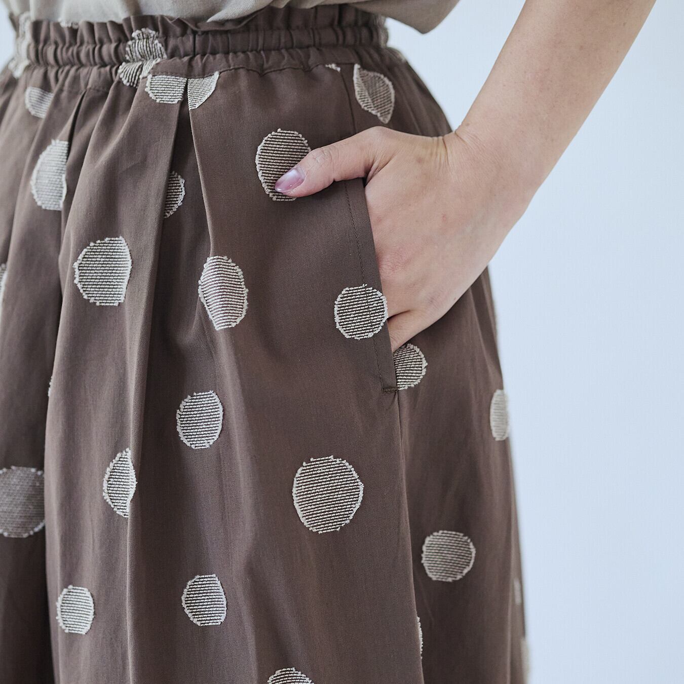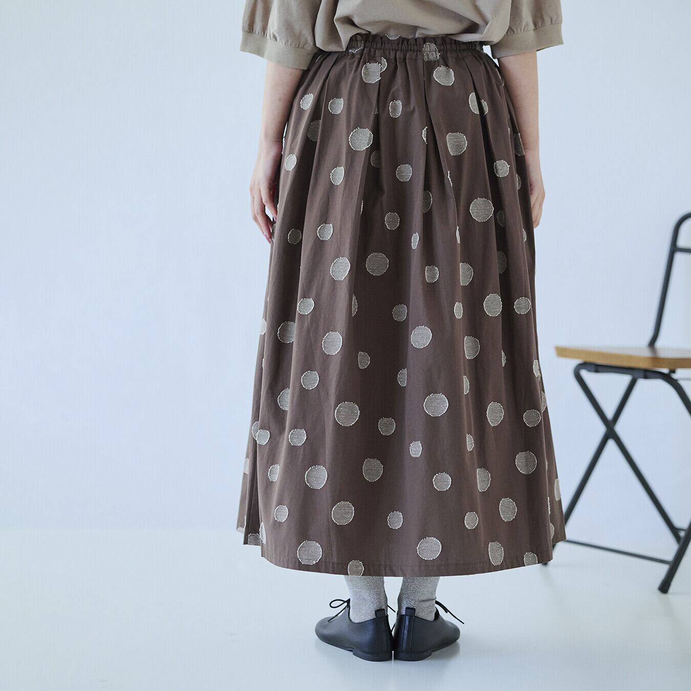 ○ポイント・ジャガード織りのランダムドット柄で、甘すぎない大人表情・ウエスト総ゴム+内紐付きで、ストレスフリーな穿き心地・同素材トップス展開あり、セットアップ提案で売場づくりに◎ ▶ ナチュラル派バイヤー様におすすめの主役スカート