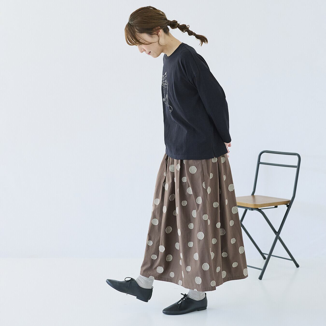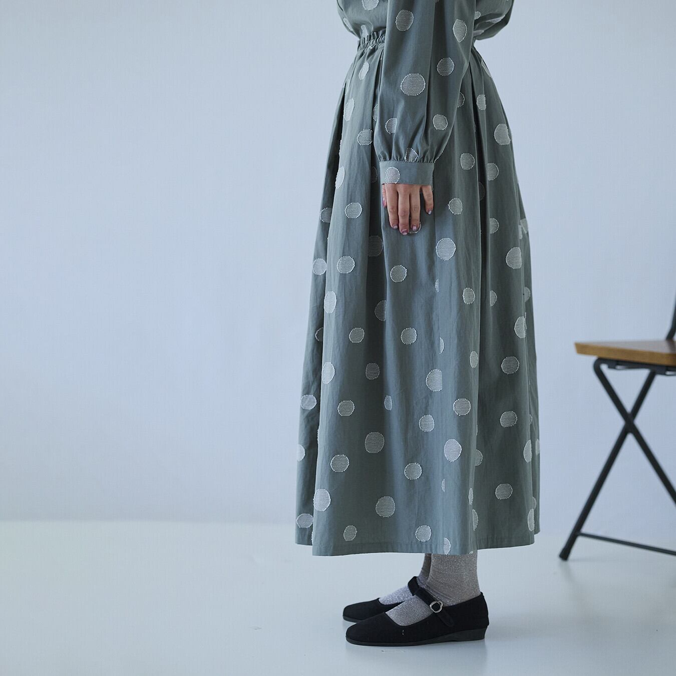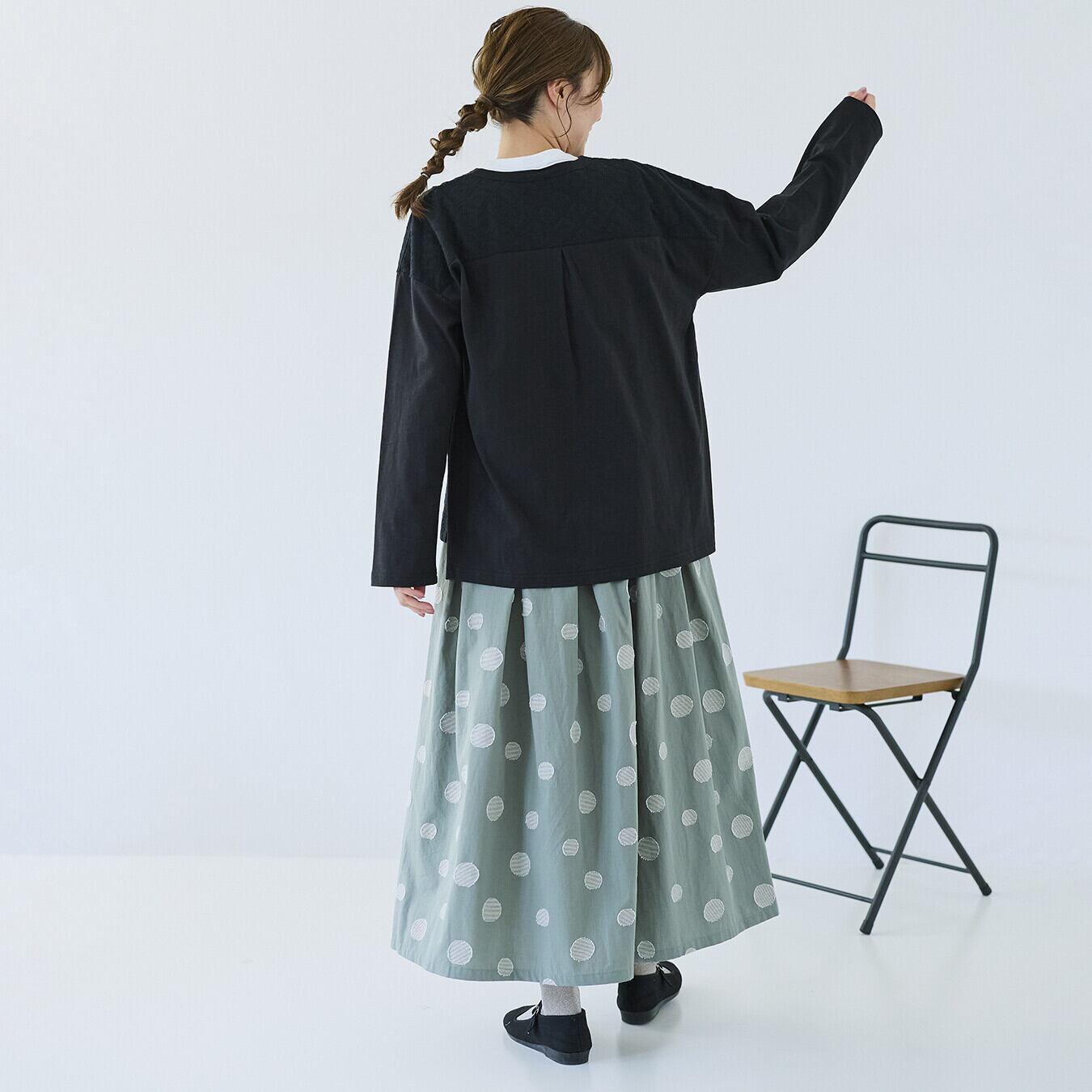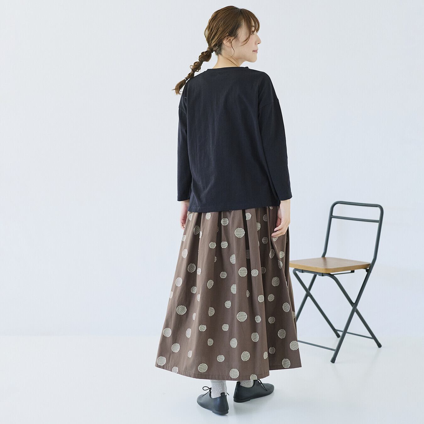 ○ポイント・ジャガード織りのランダムドット柄で、甘すぎない大人表情・ウエスト総ゴム+内紐付きで、ストレスフリーな穿き心地・同素材トップス展開あり、セットアップ提案で売場づくりに◎ ▶ ナチュラル派バイヤー様におすすめの主役スカート