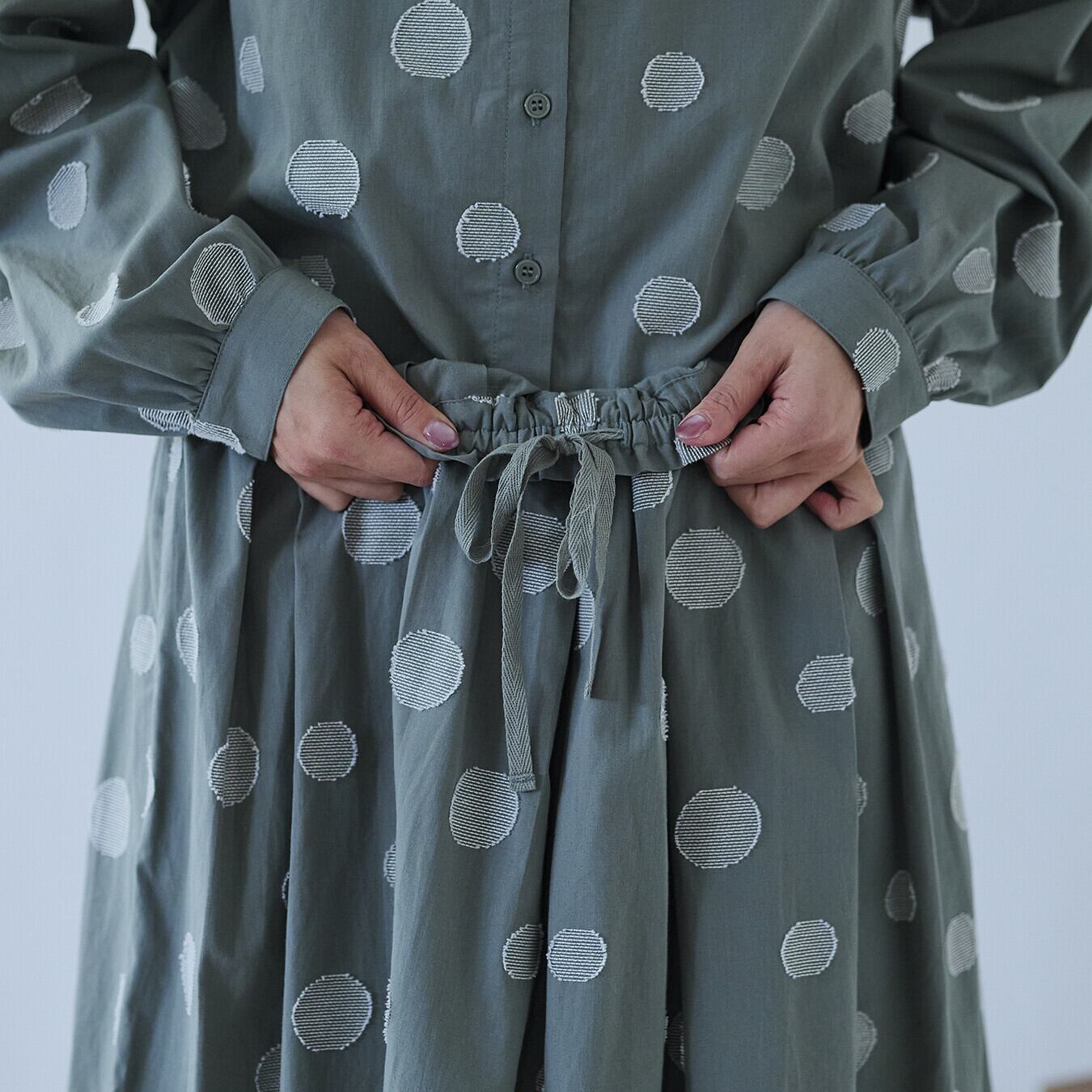 ○素材先染めコットン100%のジャガード素材を使用。程よい厚みと柔らかさがあり、シーズンレスに活躍します。織りで表現したドット柄が、プリントにはない奥行きを演出。