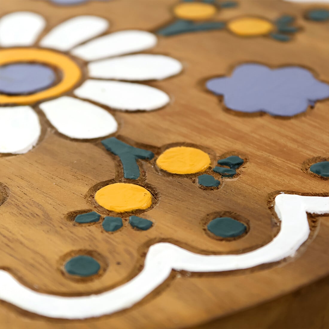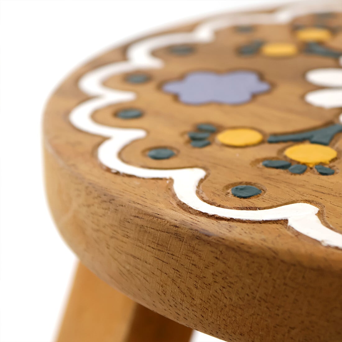 座面の柄はひとつひとつ手作業で彫られています。ディスプレイ台や、玄関で靴を履くときの腰掛にもちょうど良い高さです
