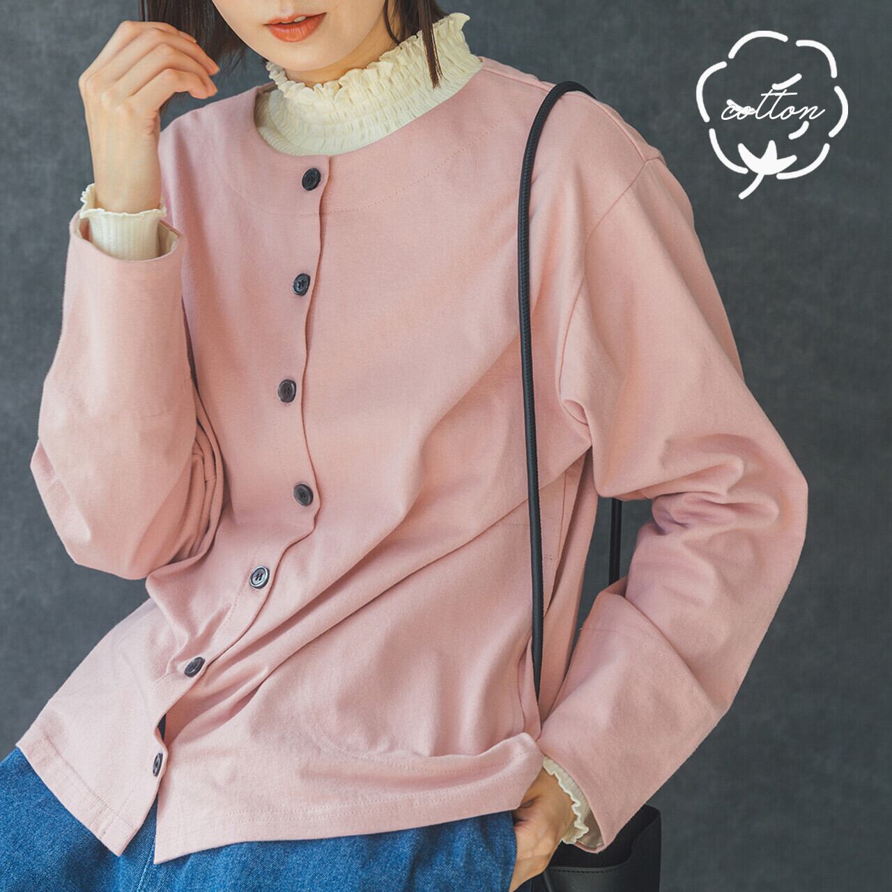春らしい柔らかカラーが目を引く、コットン100%のクルーネックカーディガン。