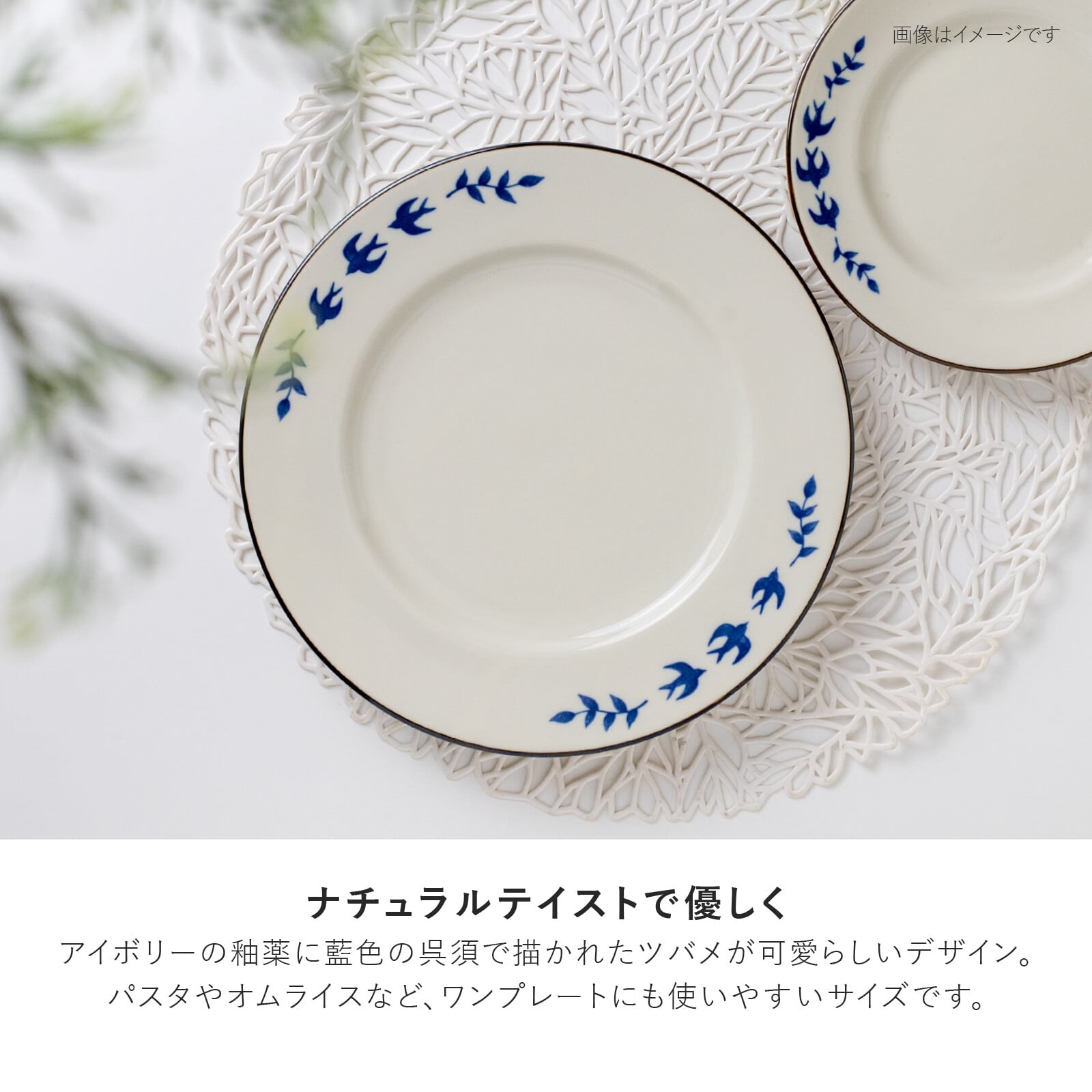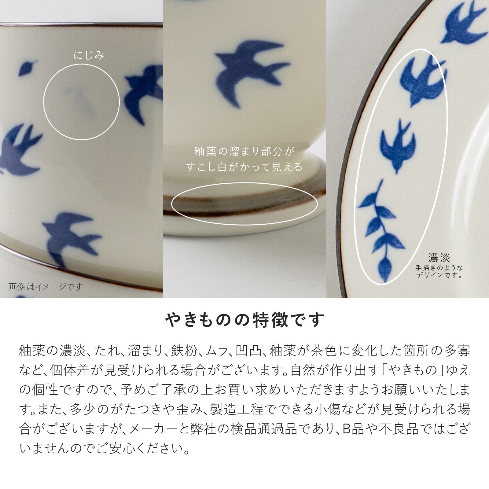 アイボリーの釉薬に、藍色の呉須で描かれたツバメがかわいいデザイン。
