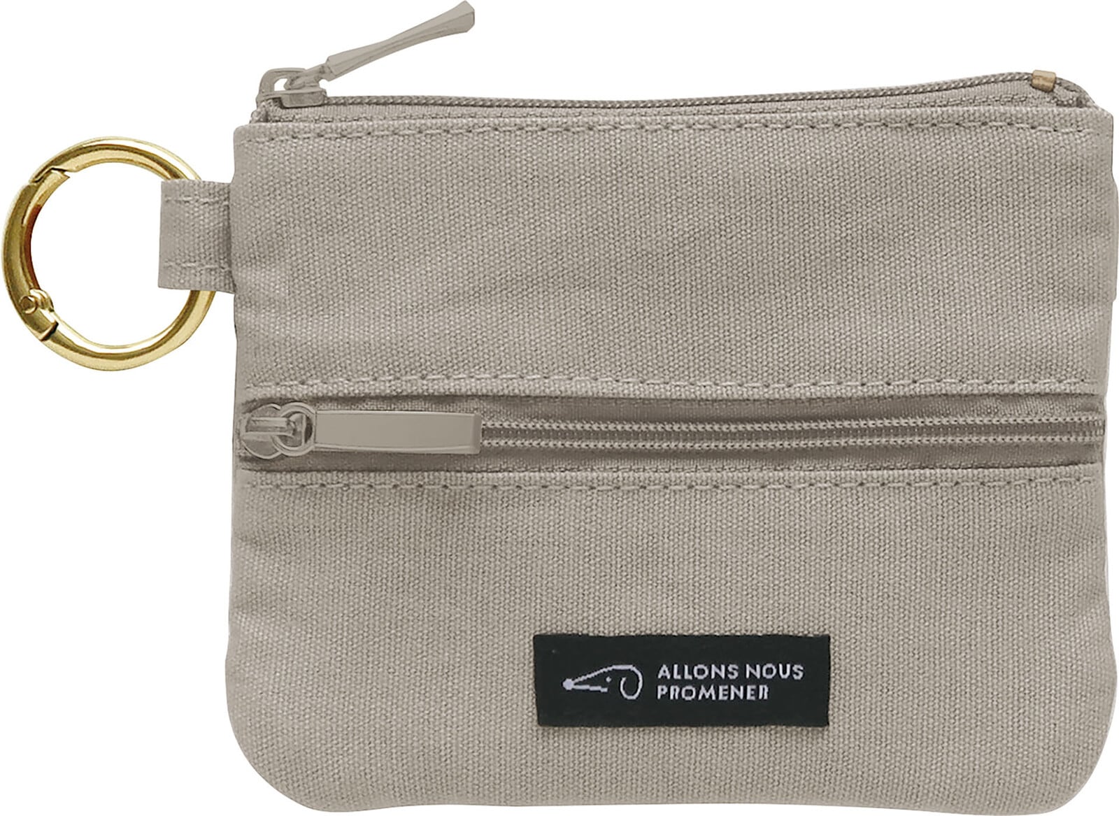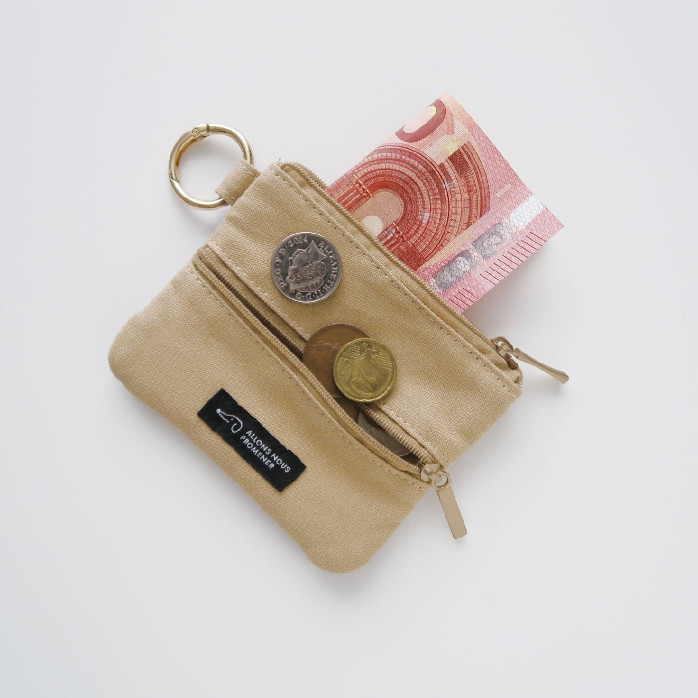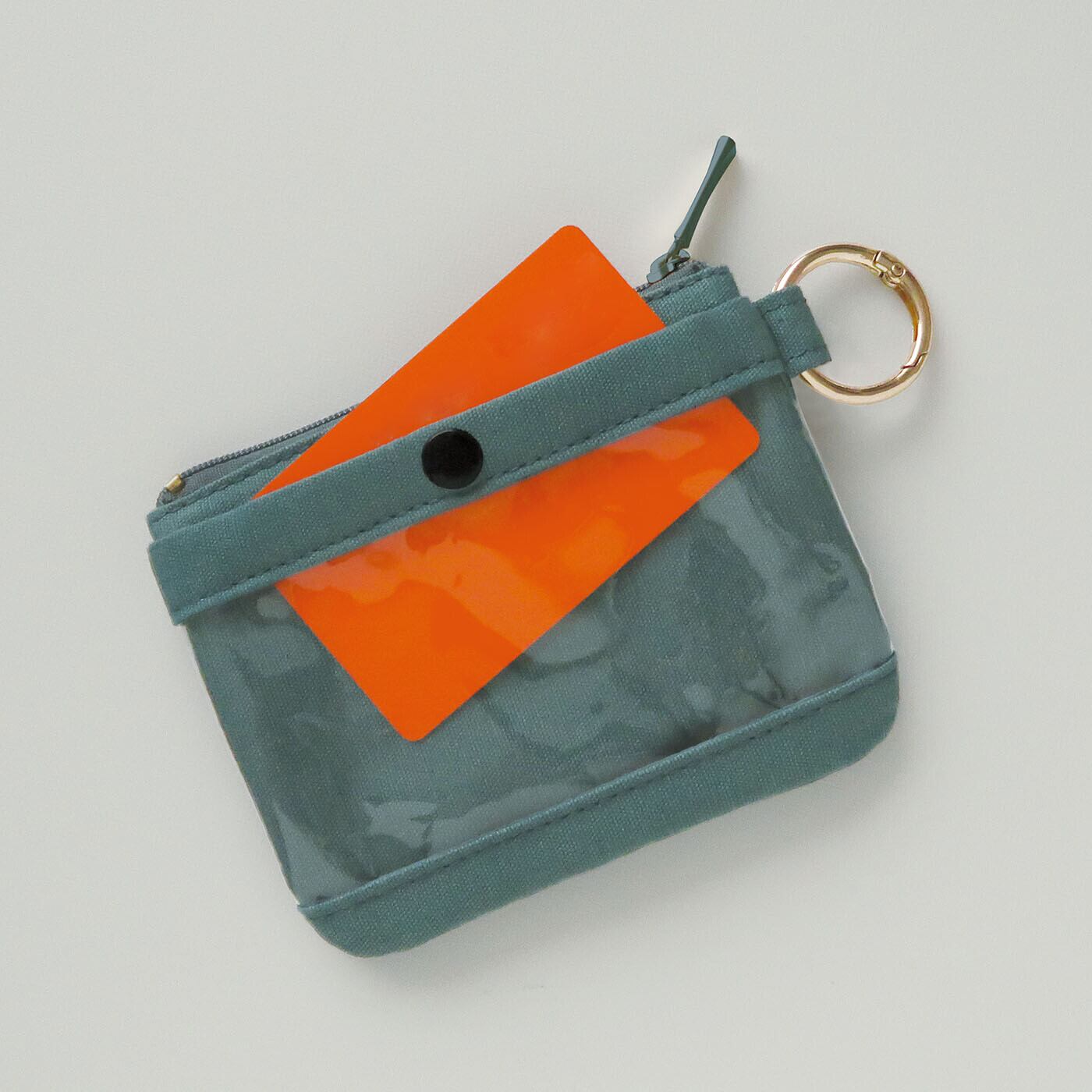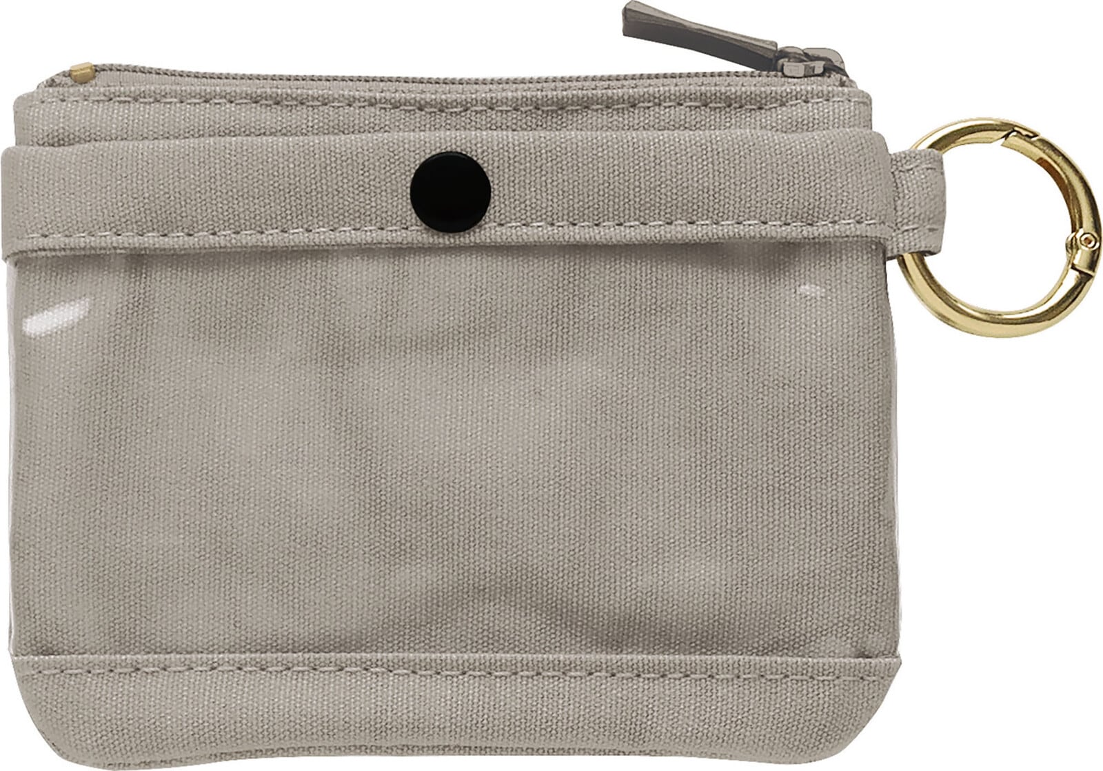 硬貨、二つ折り紙幣、カードが入るサイズのミニポーチ。表面は硬貨や鍵が入る浅型ポケット、背面はICカードが入るクリア素材のポケットになっています。カラビナをベルトホールに引っ掛けて手ぶらでお出かけしたり、カバンの持ち手に引っ掛ければ迷子になるのを防ぎます。