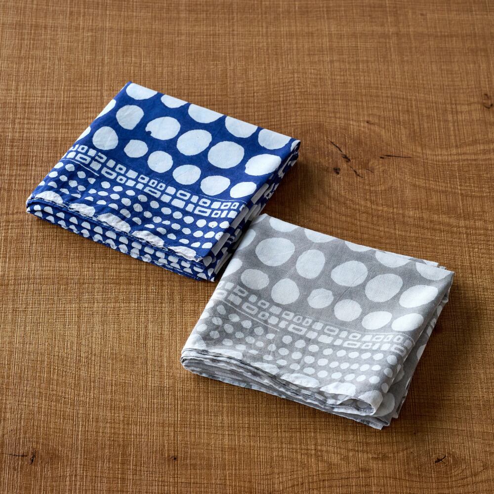 しかくとまるのちいさな図形が並んだ ブロックプリントのハンカチ(2色)